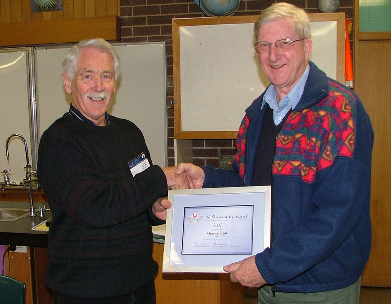 Further, Geoff was able to present the Al Shawsmith Award to Graeme Scott VK2KE for his article in July 2007 AR on Teaching Amateur Radio Classes. Graeme had been invited to conduct the Club elections and was surprised to receive his award in front of fellow members.