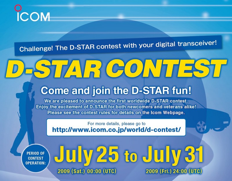 The contest will run from UTC 00:00 July 25, 2009 (Sat.) until to 24:00 July 31, 2009 (Fri.) The contest is open to any ham radio station worldwide operating D-STAR equipment and will take place on the 144, 430 and 1200MHz bands using DV mode.