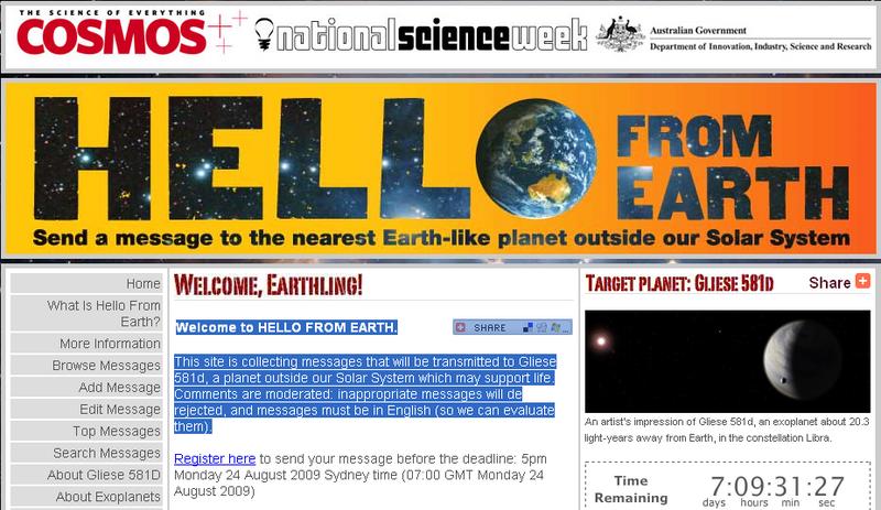 An Australian website "Hello From Earth" is collecting messages that will be transmitted to Gliese 581d, a planet outside our Solar System which may support life and all this, as part of 2009 National Science Week.