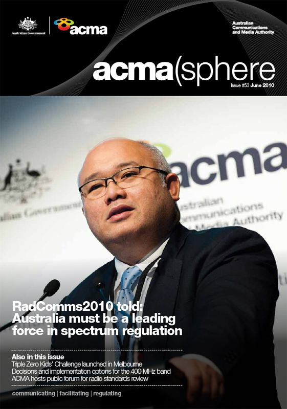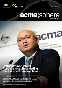 ACMAsphere is the ACMA's monthly newsletter, covering its activities in the fields of broadcasting, the internet, radiocommunications and telecommunications. Page 16 of issue 53, June 2010 is devoted to amateur radio, primarily an article “Working with the amateur community to ensure spectrum integrity” but with a box highlighting the WIA centenary and quoting the ACMA Chairman Chris Chapman at the WIA dinner. The main article discusses the recent cancellation of an amateur licence, previously reported by the WIA.