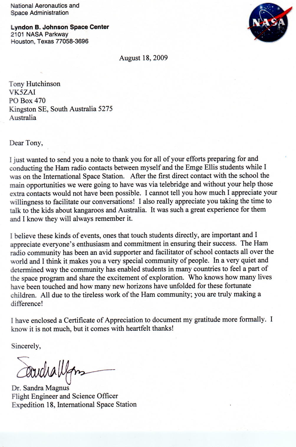 It's sad to know this is the last flight for the shuttle fleet. I have been told there will be a large crowd at Kennedy Space Port watching the final launch and that many of the NASA staff are going over to Kennedy to witness the last flight. It's of special interest to me as astronaut Dr. Sandy Magnus is in the crew. I have worked with Sandy on numerous occasions and formed a close friendship. Below is one of the thank you letters she sent me after her Exp.18 flight.