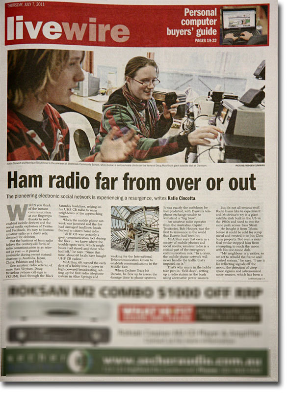 The article touches on the serious side of things. Amateur radio proved itself to be relevant and invaluable during recent natural disasters in Australia, Japan, China, Pakistan and Haiti. It quotes veteran Doug McArthur VK3UM on his Black Saturday bushfires experiences, and even before that, the aftermath of Tropical Cyclone Tracy in 1974. Of course his moon-bounce and beyond exploits from the giant dish on his country property is featured.