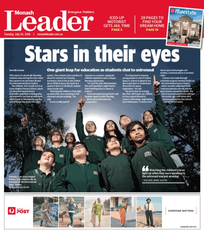 The local Monash Leader newspaper has reported on last weeks ARISS contact with Essex Heights Primary School. The front cover article which appears in the 24th of July edition, reports on the success of the linkup with with Astronaut Serena Aunon Chancellor. The article mentions ARISS and Amateur Radio's part in making the contact possible.