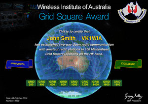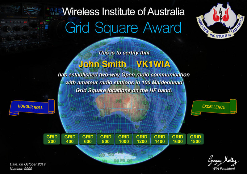 Individual WIA GRID SQUARE Awards, together with endorsements, are available for HF, 6M, 2M, 70cm, 23cm, and SHF. Current grid square counts will be displayed in a Standing list.