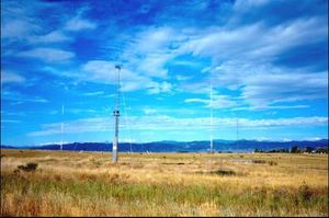 Each transmitter is connected to a dedicated antenna, which has a height corresponding to approximately one-half of its signal's wavelength, and the signal radiation patterns from each antenna are omnidirectional. The top half of each antenna tower contains a quarter-wavelength radiating element, and the bottom half uses nine guy wires, connected to the midpoint of the tower and sloped at one-to-one from the ground—with a length of √2/4 times the wavelength—as additional radiating elements.