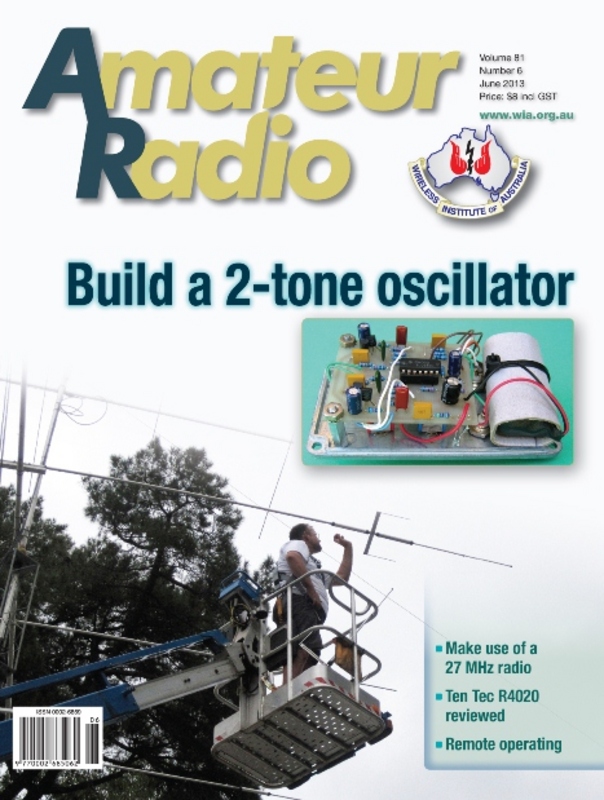 The 7 MHz traps being installed on the HARG HF beam. See VK6 News on page 41. Inset: A view inside the low distortion two tone audio oscillator by VK5JST. See page 14. Photos by Bill Rose VK6WJ, inset by Jim Tregellas VK5JST.