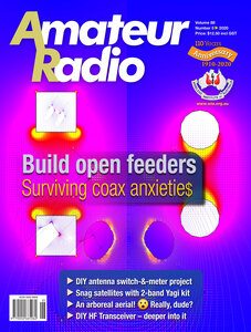 Hence, our feature is on the practicalities of designing and building your own open feedlines (careful . . equations!). The feature DIY project is an antenna switch for the shack with a built-in power-and-SWR meter, from the indefatigable Jim Tregellas VK5JST. It’s nicely set off by an article on a novel arboreal aerial for the MF bands. Also, we have a review of a dual-band (2m/70cm) Yagi kit, and a review of an automatic antenna matcher/tuner kit. Even our VHF/UHF and Meteor Scatter columnists have thrown-in some cogent catchwords on antennas.