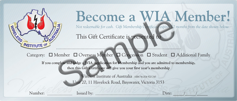 Why not encourage your friends to become members of the Wireless Institute of Australia by giving them a "Become a WIA Member" Gift Certificate. Available for purchase in Full, Concession, Family and Overseas membership grades. **