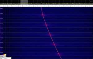 (See image above - beacon drifting almost 600 Hz over a period of about two minutes - Spectran audio analyzer display, courtesy of Iain VK5ZD. - Click the picture for a larger view)