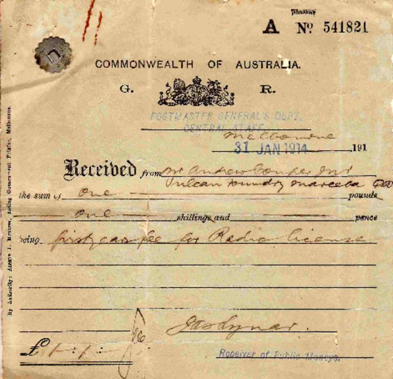 The receipt (above) was issued to Andy Couper of Mareeba Qld. for his station licence XQM in 1914. Andy later became 4BW and then VK4BW.