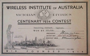 1934 saw the first major international contest sponsored by the W.I.A.. Known (perhaps incorrectly) as the Centenary Contest, it was a great success with over 50 countries participating. From it flowed the VK/ZL Contest commencing in 1935.
