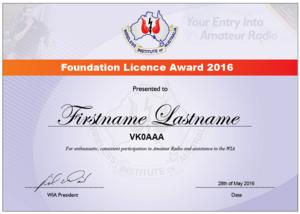 The Foundation Award was introduced in 2016. It is presented in recognition of exceptional service to the hobby of Amateur Radio and The Wireless Institute of Australia by a Foundation Licence holder.