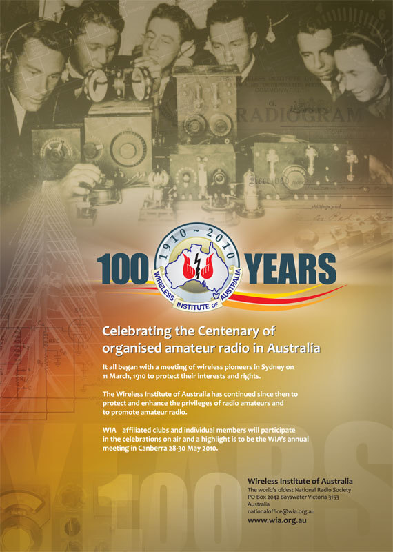 The celebration is recognition of the foundation of the WIA and the very start of organised amateur radio in Australia during 1910. It has also helped to focus renewed attention on the early history of amateur radio in this country through careful research in a way not previously known to have occurred. For the full year being January through December 2010 and with the help of it's members, the WIA will celebrate the Centenary of organised Amateur Radio in Australia.