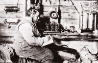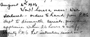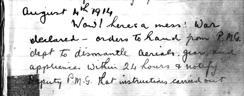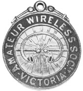 Photos above from top to bottom : a) The WIA Centenary poster, b) Wally Hannam - the first Secretary of the Institute of Wireless Telegraphy at Mawson in 1911, c) Part of the Sydney Morning Herald's Report of the first meeting, d) Log entry by Arthur Cotton XVS (later 5HY) at out-break of WWI, e) Amateur Wireless Society badge from a design adopted on 19th November 1911, f) Ivan Hodder (Later VK3RH and radio inspector for civil aviation 1938-1964) at Stawell school of mines station. Photograph circa 1919. Click any of the photos for a larger view.