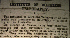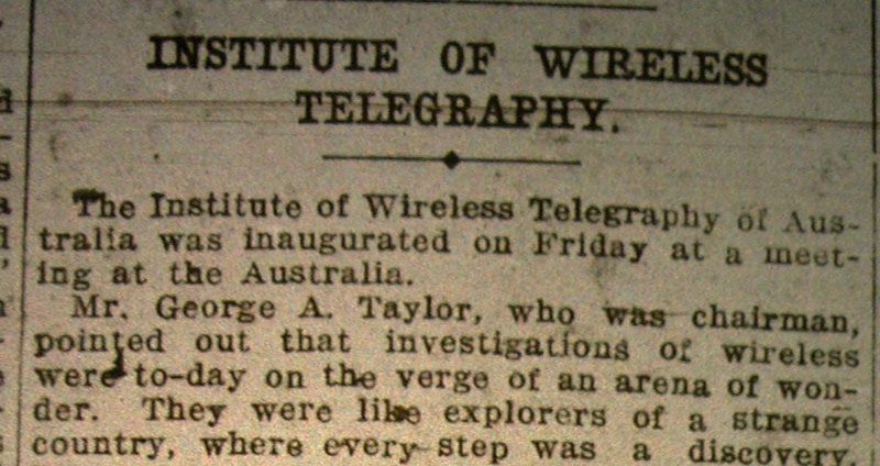 On 11 March, 1910 a meeting of like-minded people in the Hotel Australia, Martin Place, Sydney, formed the Institute of Wireless Telegraphy of Australia, and soon after dropped the word 'telegraphy' from its name. Chairman of the founding meeting, George Taylor, proposed "the formation of an institution amongst experimenters and enthusiasts in wireless for their mutual benefit."