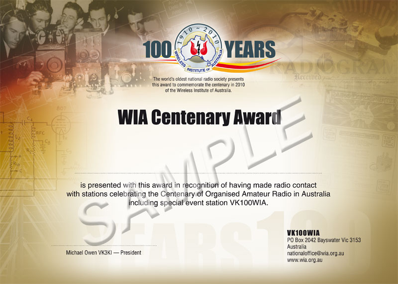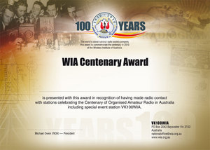 A limited issue amateur radio operating award is available to celebrate the 100th year of the Wireless Institute of Australia (WIA), the world's oldest national radio society.