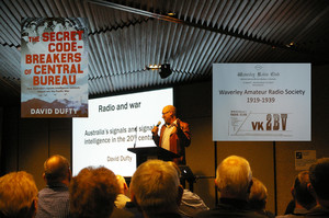 The centenary celebration took place in the symbolic Marconi Room of the Sydney Town Hall. John Buckley VK2LWB and John Harper VK2LJ took the audience through the early years of the Waverley club. They then introduced Dr David Dufty who is the author of the book - "The Secret Code-Breakers if Central Bureau - How Australia's signals-intelligence network helped win the Pacific War".